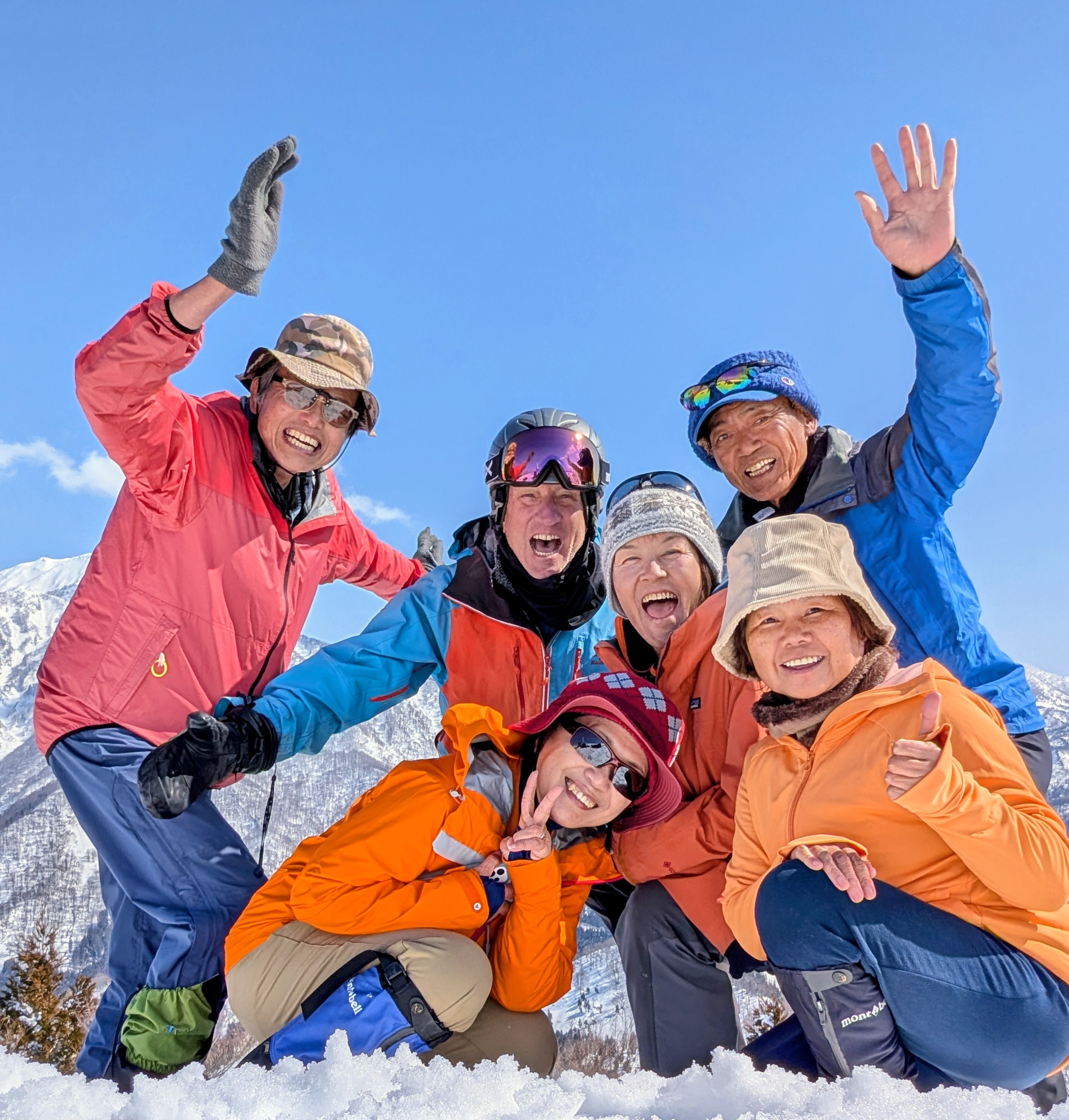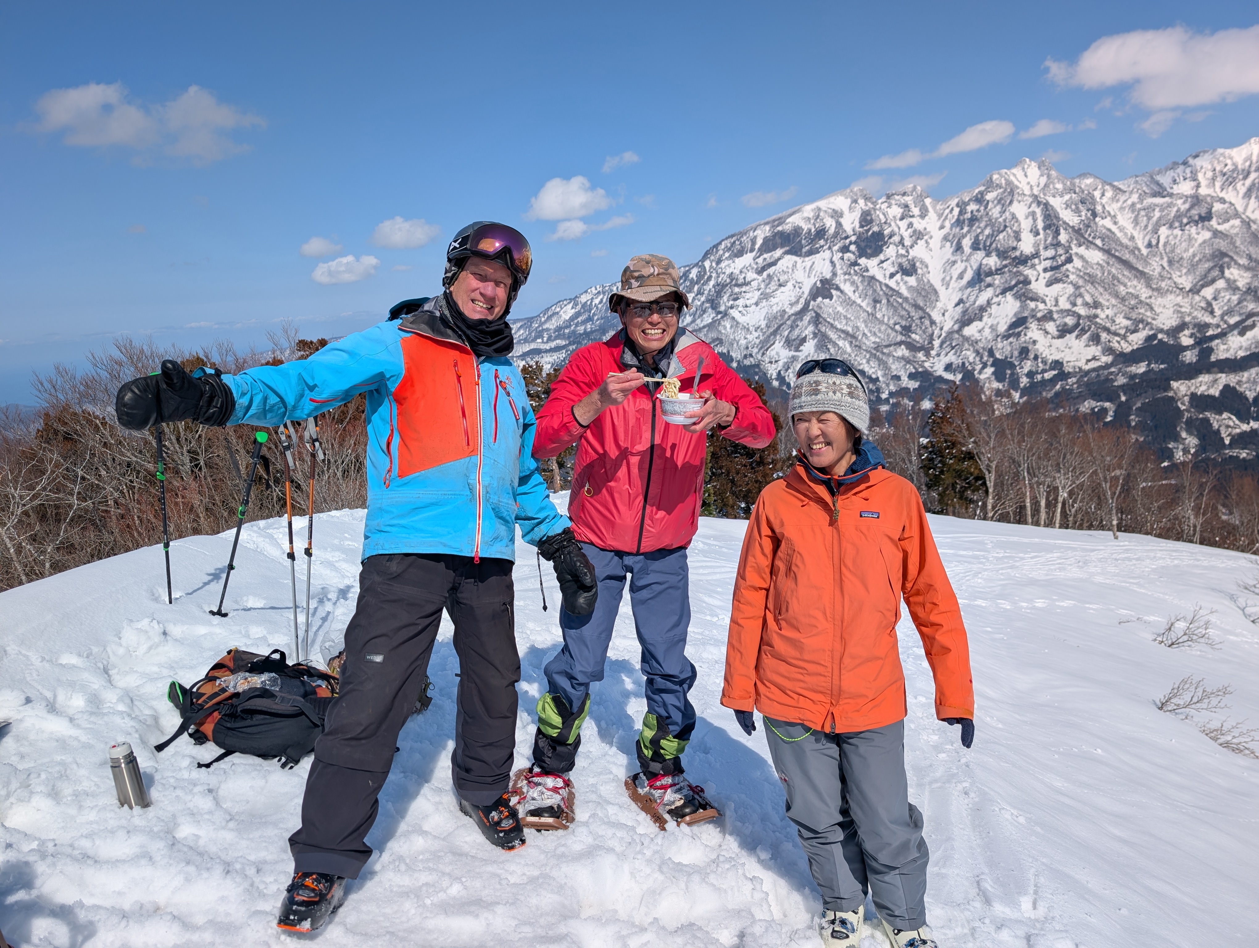 山頂で充分に絶景を楽しみました。大町からのスキーヤー3人とも仲良くなりました。