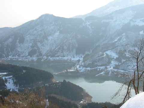 やがて刀利ダム湖が左下に見えてくる |