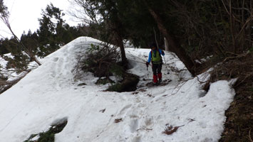 4/7 お天気の事と大倉山提案では「山ノ神」がイヤな顔をする事もあり、赤祖父山とした。 (密かに大寺山も・・) そして、大倉山は順延?とした。福寿草群生地を後回しにして、赤祖父山を目指した。上の林道に出る前に、元気な二人の女性がやって来た。「こちらは年寄り、お先にどうぞ!」 としたが、遠慮されたのか我々が先となる。
