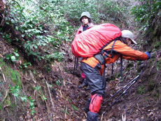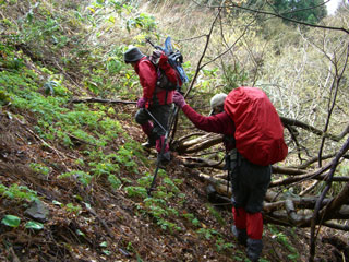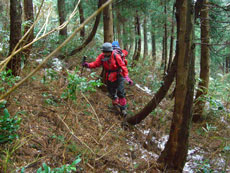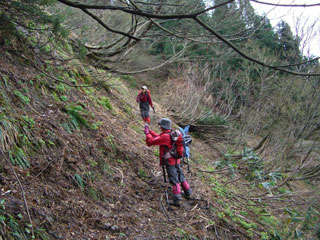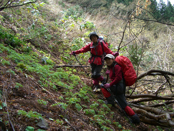冬期通行止の標識を忠実に守り、林道歩きから始まった。福寿草が咲き誇る様を見た2人は、大喜びであったが、ある程度の残雪を期待していたルート選定は、悉くハズレ、2ヶ所のヤブ漕ぎを強いられ、山頂(扇山)滞在は1時間ほどになってしまった。