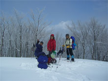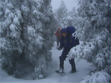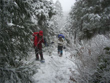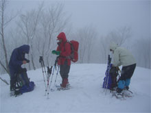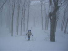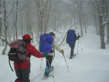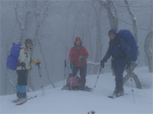 そうなれば、もう一つの楽しみになる。標高550mから雪上になり、700mからスノーシュー装着。横殴りの雪になるが、「雨よりはいいね!」 と呆れた会話になる。900mからは、真っ新な雪上を歩く事になり、靄っていても、何故かルンルン気分となった。