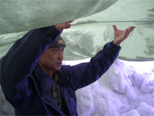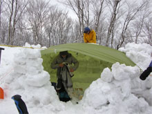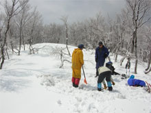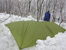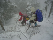 赤祖父山から30分、988mの標高点に達した時点で、何故か一時的に青空が見え始めた。「お腹すいた。」「ここで止めよう。」などの雑音に、すぐに纏まってしまい、シェルター造りに精出す事になる。まだ、この山域のこの高さでは、充分なシェルターが造れ、風雨・風雪に耐える事が出来る。昨年、城端山岳会の手で、高清水山~赤祖父山間の登山道が整備されたと聞き及んでいたが、まさか、この時期に、このルートの一部を歩くとは思っても見なかったが、ずっと続くブナ林に心が奪わせ、またいつの日か訪れてみたいと思った。(今度は、高清水山まで・・)