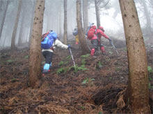 扇山到着が午前10時半であり、食事には早過ぎるし、高清水山までは遠過ぎる。ならば、「取りあえず、赤祖父山まで行って決めよう。」 となるが、すぐに到達。もう一時間高清水山方面に歩く事になる。靄っているため、ブナ林は、より幻想的に映るのであるが、北ちゃんが突然走り出してしまう。それでは、皆が付いていけるハズもない。しかし、その速さでなければ、高清水山まで行けるハズがない。雨の予想だけに、提案してみたものの、その可能性はないと思っていたのが、悔やむ結果となってしまった。(集合・出発時刻を、繰り上げせねばならなかった。)