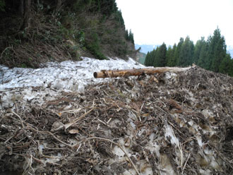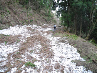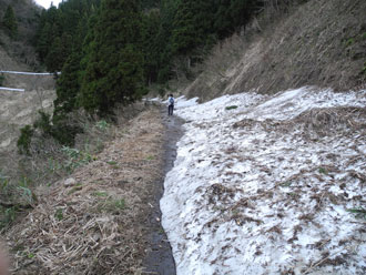 しばらく進むと、残雪が行く手を阻んだ。林道歩きは、予想通りであるから苦にはならない。