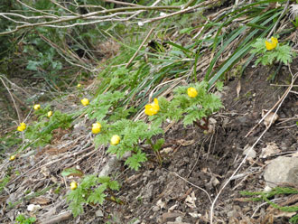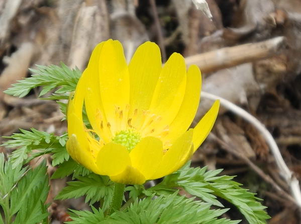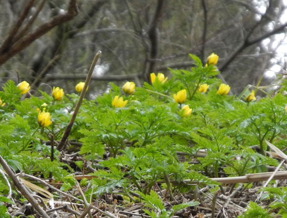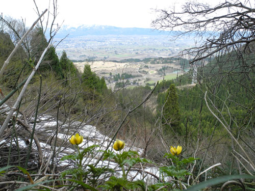 取り付き付近は、デブリでかなり荒れていたが、雪量からして、「まだ早いか?」 と思いながら急な杉林を登ったが、上部は咲き始めており、雪解け最中の所は、これからである。福寿草に特別の思いはないのであるが、じっと眺めていると、名の通り、何だか 「福」が湧いて来るような気がしてきた。何か良いことがあるかもしれないと念じる他ないであろう。