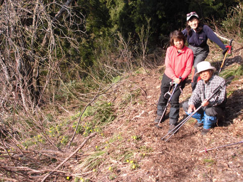 福寿草の登山口9:05=福寿草の群生地(9:20~30)=分岐10:30=林道(11:00~30)=扇山(12:05~13:50)=林道14:15=分岐14:50=赤祖父山登山口15:45=車デボ地点15:50=再び福寿草の群生地へ・・