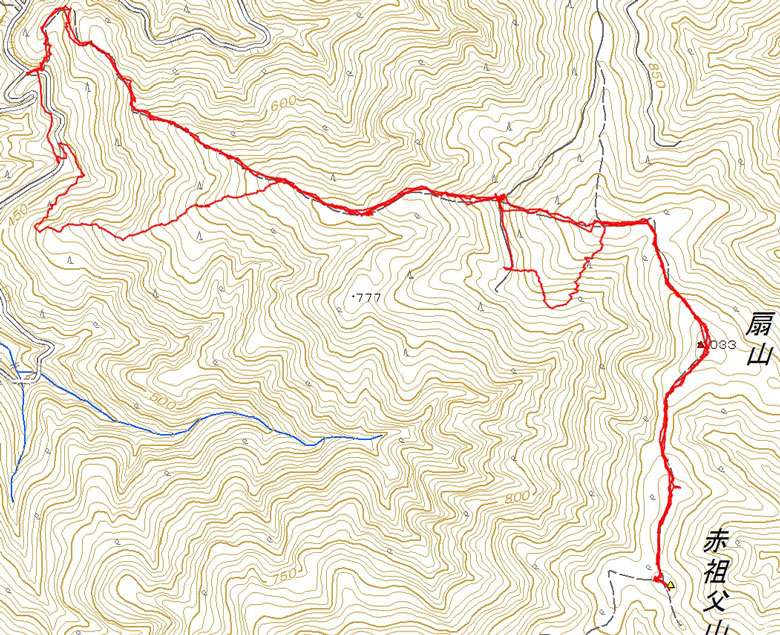 扇山登山口8:00=福寿草からの登山道と合流9:20=林道(10:00~10)=扇山11:00=赤祖父山(11:25~12:35)=扇山12:55=林道13:45=分岐(合流点)14:05=福寿草の登山口14:45=車14:55