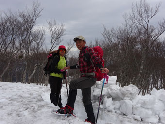 さすがに、林道に出ると雪が現れた。いつもなら、高清水山よりに林道を歩き (林道が途切れる) 杉林に取り付くのであるが、今回は、忠実に登山道を辿った。先の (いつもの) ルートと合流する地点 (大寺山が見える) でカンジキを付けた。ツボ足でも大丈夫であったが、せっかく準備してきたのだから、使わぬ事もなかろう。