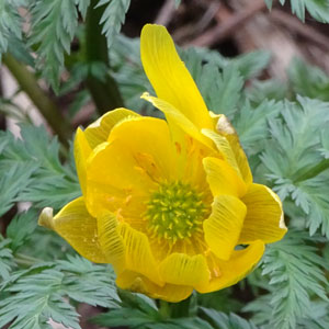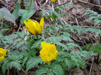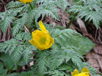下山ルートは、福寿草群生地経由としたが、思いの他、雪割草が次から次へと現れるので、なかなか前に進まなかった。でも、可愛いお花は、心を随分と和ませてくれた。福寿草もまだ健在?だったが、雲行きが怪しく暗くなったからであろうか、黄色のお花が萎みかけていた。