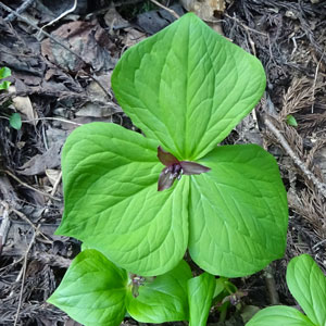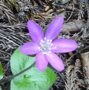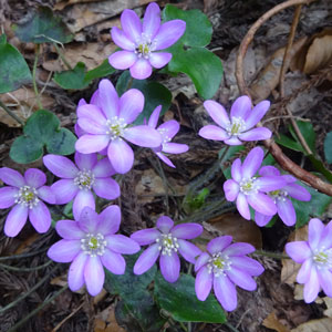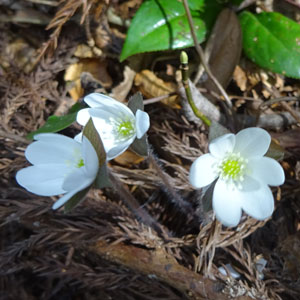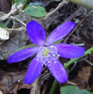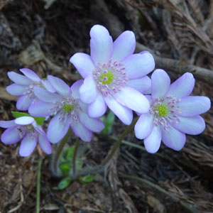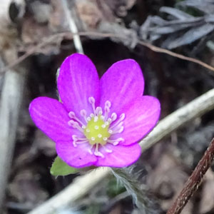 崩壊している登山口から、しばらくして、まるで小谷のような登山道に入ると、雪割草が現れた。ポツリポツリであったが、次第に 「此処にもあそこにも」 となり、福寿草群生地からの登山道に合流してからは、もっと多くの雪割草が可愛い姿でお出迎えしてくれていた。