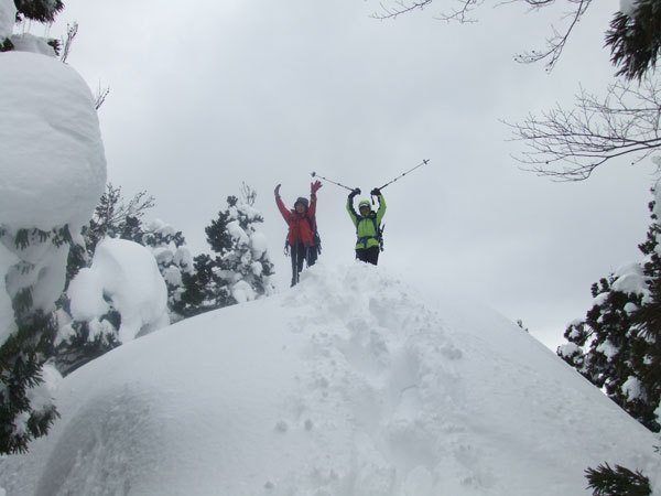 | 「赤谷ノ頭」の山頂に立つ 「ねぎちゃん」と「山ノ神」 |