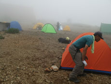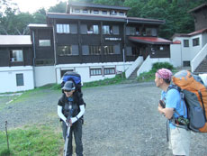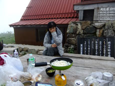 | 何とか4時前には朝日平に到着出来た。 | 小屋前のテーブルを借りて夕食となるが | 疲れたのかあまり気勢が上がらなかった。 |