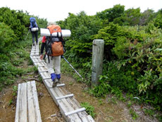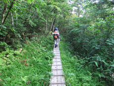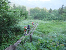 | 蓮華温泉から五輪尾根経由で朝日岳へ | キャンプ場を過ぎ木道を行く。 | 蓮華温泉から30分ほどでアヤメ平に・・ |