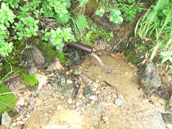 | 水場近くの休憩処で簡単な食事を・・・・ | 第1の水場を確認。意外と冷たかった。 |