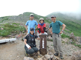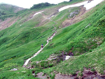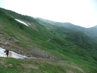 | 予定より1時間程遅れて朝日岳山頂に着く。 | 朝日平(朝日小屋)に向かって降りる。 |