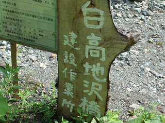 | 白高地沢橋の工事が行われている。 | 仮橋は少し上流にあり、川沿いに歩かなければならない。 |