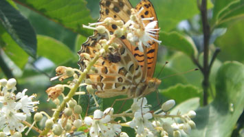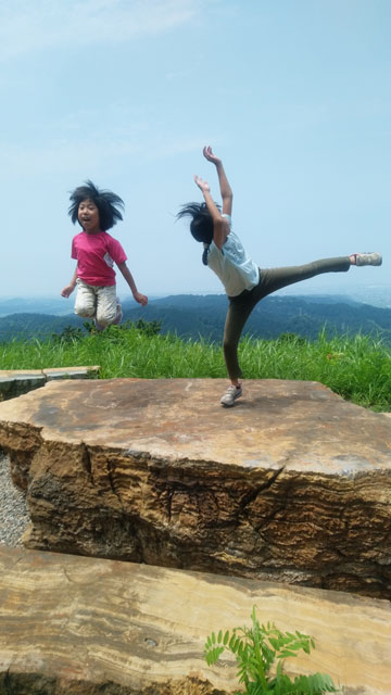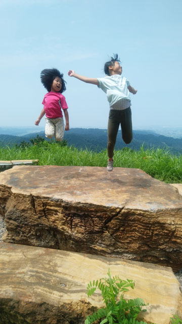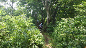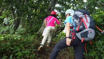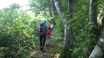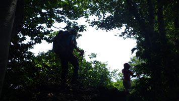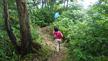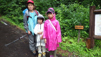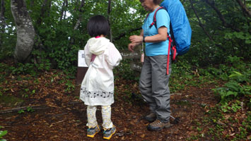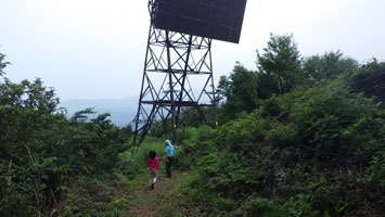 車の中で待機である。しばらくして、小降りになったので、「行くぞ・・」 と言うと、「こんなのに行くの?」 の返事である。 「大した事はない! 山頂まで30分も掛からない。」 とゲキを飛ばした。稜線に出たら雨が止んだ。今度は暑いである。それでも、山頂の東屋に着いてからは、カップ焼きそばを食べ、アゲハやバッタなどと言って結構楽しんでいたようである。