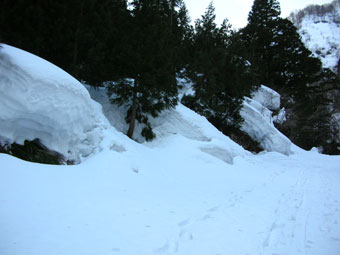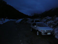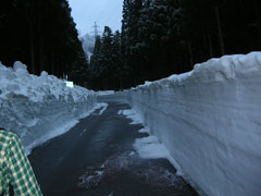 | まだ暗い、5:25にスタート。 | 除雪は行われていたが、 雪壁が続いていた。 |