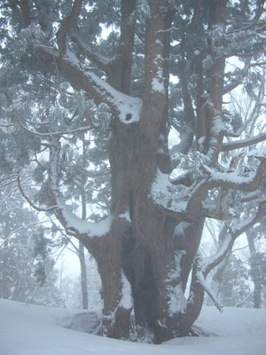 | 9:40 鉄塔の尾根と合流して、 1,075m付近に大きな杉の木があった。 |