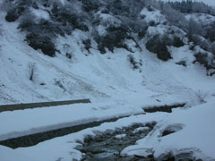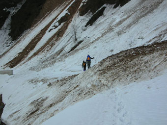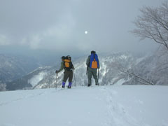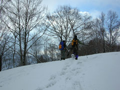 | 復路は、鉄塔の尾根に沿って、林道に出た。 | 南又谷の林道(雪上)を行く。 |