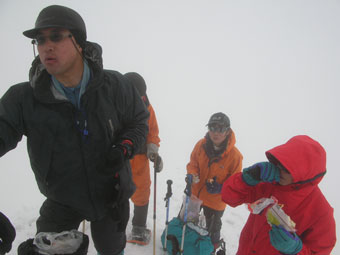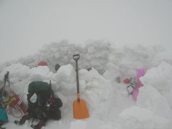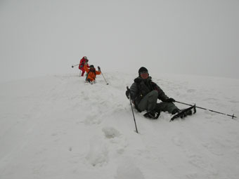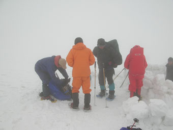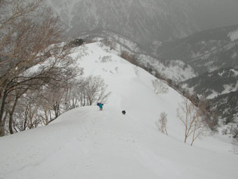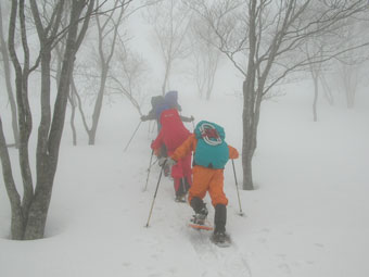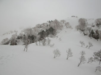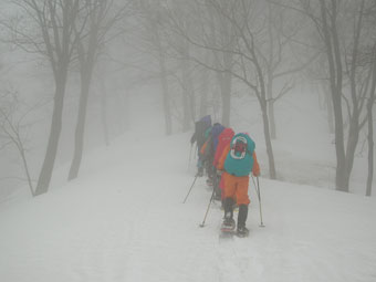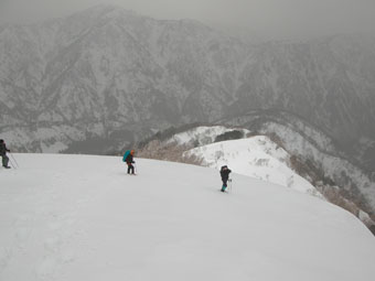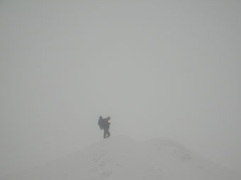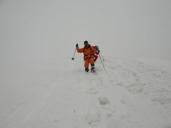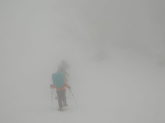 雪を掴まえると、一昨日のものであろうスキーのトレースを発見したが、雨は止んだが視界はなく闇の世界の登高となった。急登を凌ぎ、稜線に出てからの真っ白な世界では、ストックで雪庇を気にしながら、GPSを巧みに操り山頂を踏んだ。