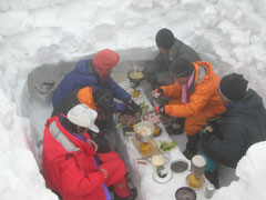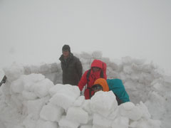 風当たりの強い山頂で、一瞬でもの展望を期待しての宴会場の設営となったのであるが、今日は入口に強風が吹き込まない対策を高じてみたが、いつも入口で震えている私に取っては奏効したと感じられた。