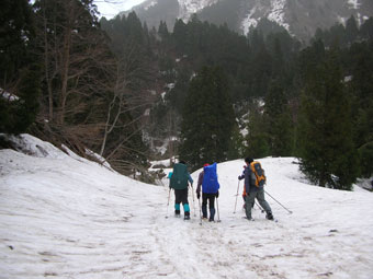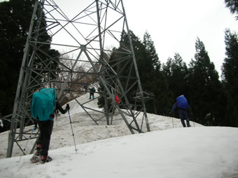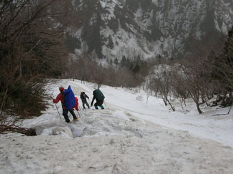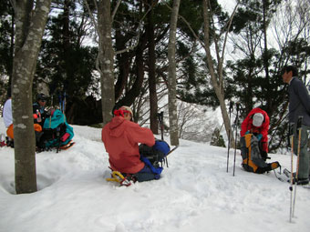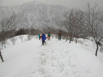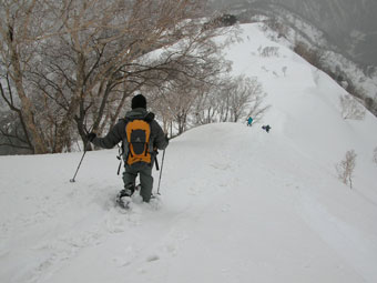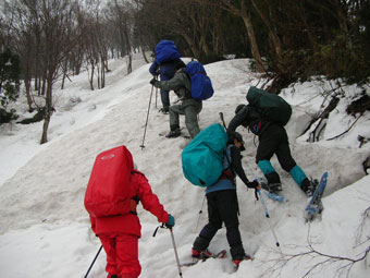 予想通り取付いて、しばらしてから、少々ヤブに悩まされたが、「このようなものは、ヤブ漕ぎには入らない。」と北ちゃんの一喝で、それもそうかと思ったが、スノーシューを持て余してしまった。