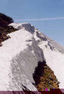3月5日の雪庇崩落事故のあった大日岳頂上への稜線の北側には大量の残雪があり、愛らしい雷鳥も出迎えてくれたのだが、おのずと、大きく裂けた残雪に目がいってしまう。立山、奥大日岳まで見えるのだが、また剱御前岳まで時折見えるのだが、剱岳本峰はガスに覆われてその姿を見せない。