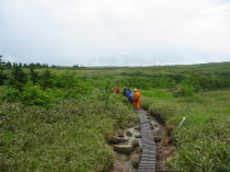 尚も続く木道を歩きながら、チングルマ、ワタスゲ、ツマトリソウ、、イワイチョウ、ニッコウキスゲなどの写真を撮る。暫しペースが落ちるが、また同じように歩き続ける。