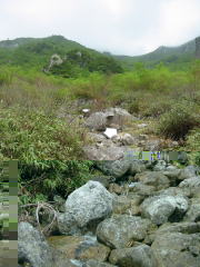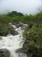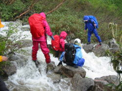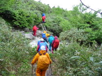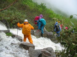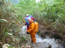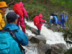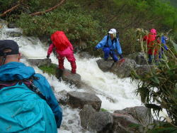 5~10分も歩いたであろうか。またまた流れが行く手を阻んでいた。その頃は雨も大分小降りになり、沢を渡るのも3回目となっていたので、皆心にはゆとりが出来、顔には緊張感がなかった。