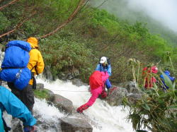 どれくらい時間が経ったか分からないが、男女4パーティーが降りて来た。停滞している事を告げたが、少し水位が下がったような感じになったので、強引に沢を渡って行った。私達も後に続いたが、そこでは20数人が足止めを食っていた。