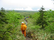 高度が下がって、雨具を着ていると、まるでサウナにでも入っているように、汗だくになる。雨具を脱ぐと、また雨が降るなどと笑いながら、山荘を後にする。最も脱ぐのが面倒くさいからでもあったが・・・・