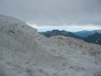 山頂への稜線は、剱岳や北方稜線に対峙する北東側だけが多くの残雪に覆われていた。所々大きな裂け方をしている所もあるが、近付かなければ心配する事もない。