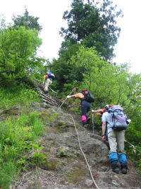 牛首尾根のロープの 付いた階段を行く |