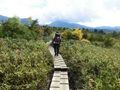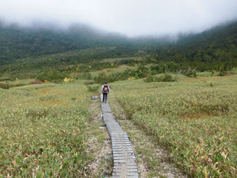 大日平山荘まで、長い木道が続く。 |