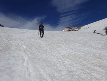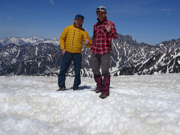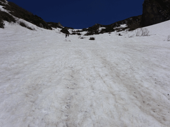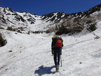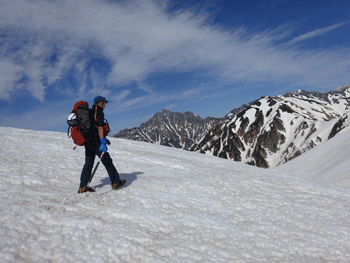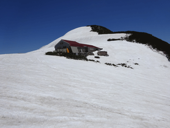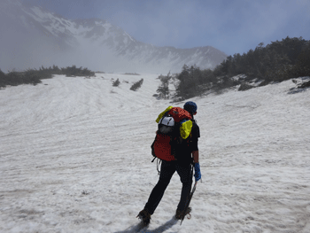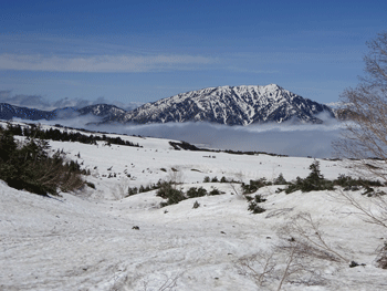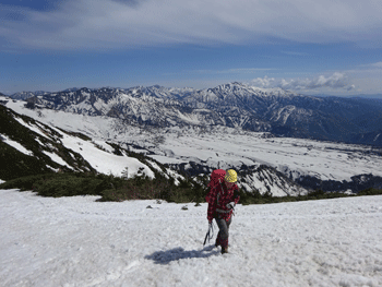 雪上になってもガスの状態が続きていたが、大日平半ば辺りから、一気にガスが晴れ、紺碧と言えばいいのか、それとも群青色と言えばいいのか、真っ青な空になった。しかも、風がなく、素晴らしいお天気になったのである。後は、大日小屋に向かって歩くのみであった。しかし、標高2,000m辺り(二又になっている所)から、ピッチを上げるガリ君に付いていけなくなってしまった。