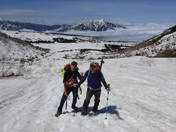 5/20 大日岳へは、30歳ほど若いガリ君が一緒してくれる事になった。8号線からは、北ア北部の山々が雲の上に頭だけを出していた。もしかしたら、「雲上の人」 になれるかもしれないと思いながら車を走らせた。登山口辺りから、ガスの中の歩きになる。「やっぱり、明日の方が良かったかね!」 と言いながら、先行くスキーヤーに必死に付いて行った。(結果的にこの3人だけが山頂へ)