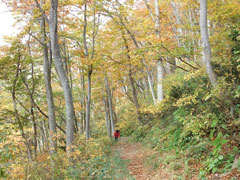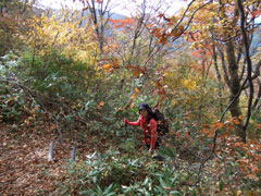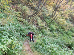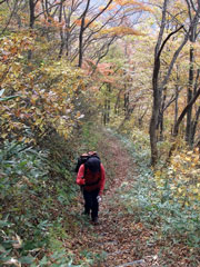 私のリハビリ?(膝痛の確認)には最適だと思ったからであるが、鋲岳周辺は最高の紅葉であった。午後からのお天気が心配であったが、小春日和と言うのであろうか、ちょっぴり薄日が差す快適な状態である。それどころか、上着まで脱がなければならぬ暑さであった。