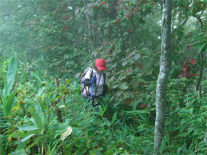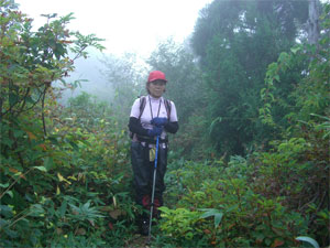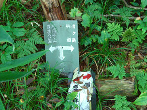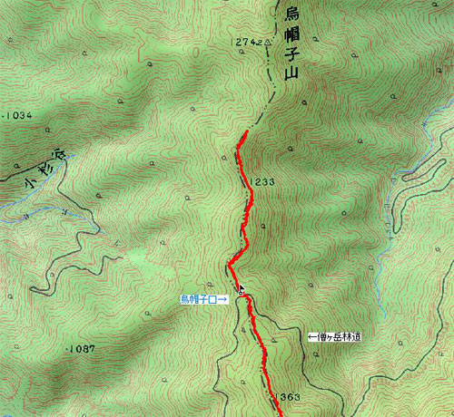 烏帽子山に登ろうとは思っていないので、緯線・罫線の入ったカシミール地図も用意してなく、ちょっぴり不安であった。標高1274mだから、あと残り20mであったが、先が見えなく、降っていたので、諦め引き返す事にした。
