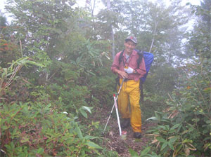 「1時間もあれば、何とかなるであろう。」 と思っていたが、またまたガスに覆われてしまった。草木は伸びていたが、真新しい中部森林管理局の境界見出標が案内してくれた。小杉谷への分岐を過ぎ、少し登り返した地点で、午後4時半。