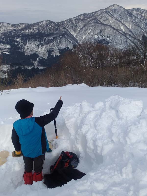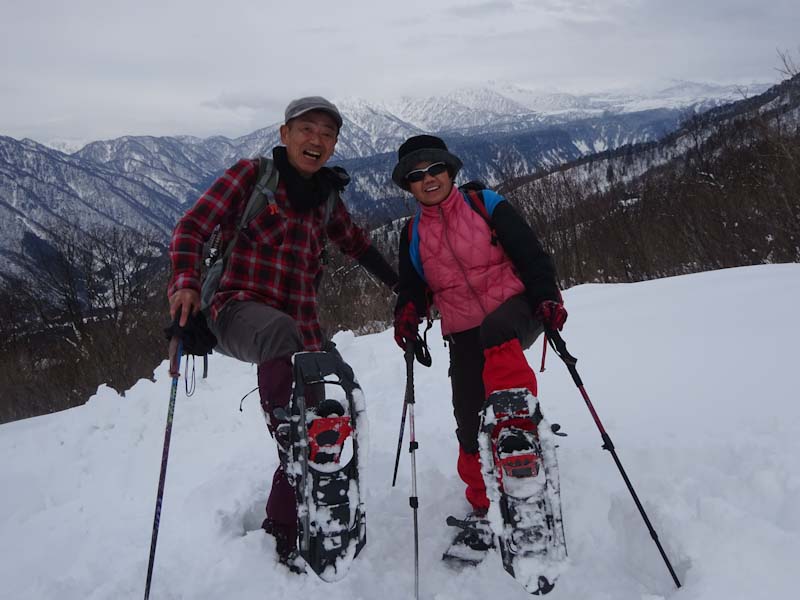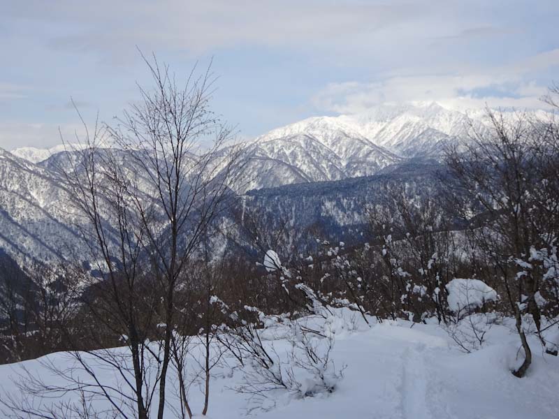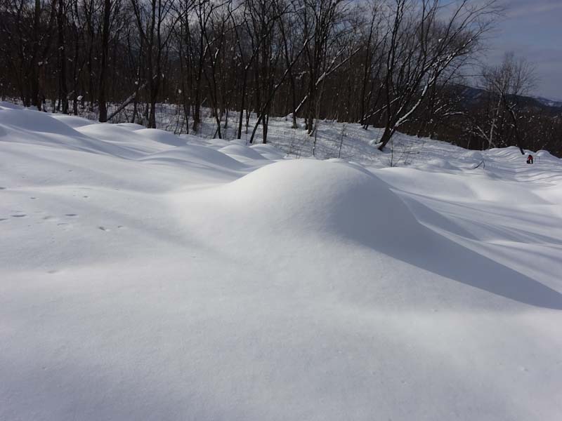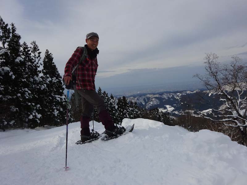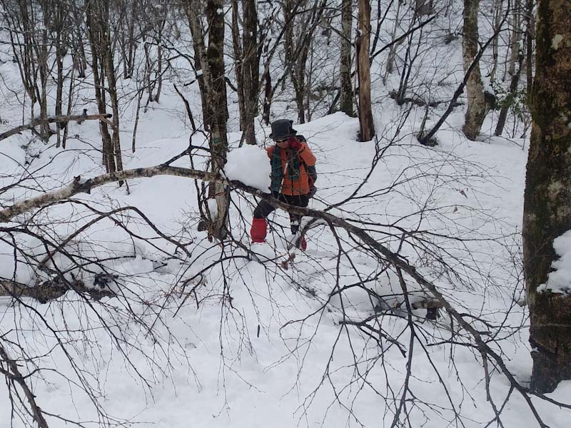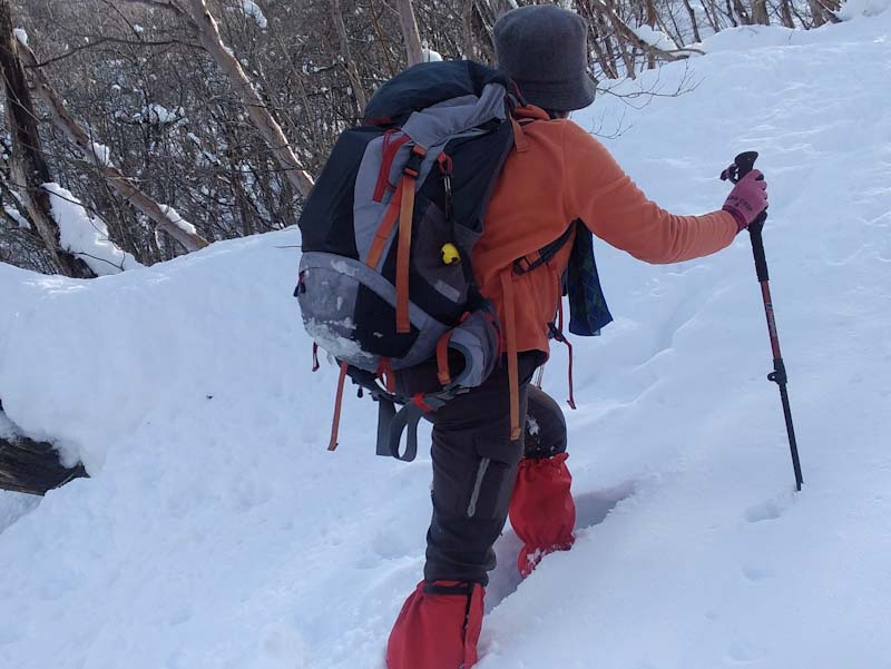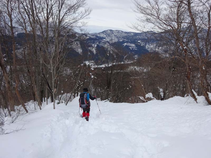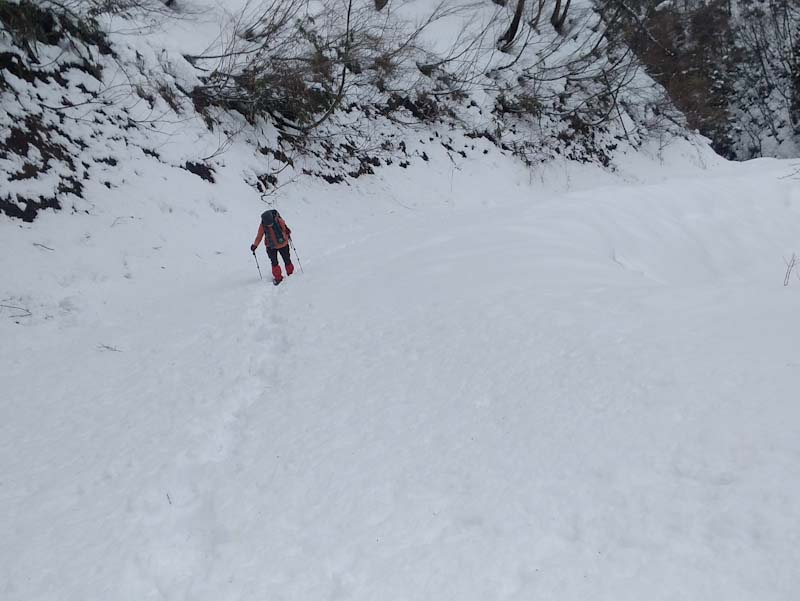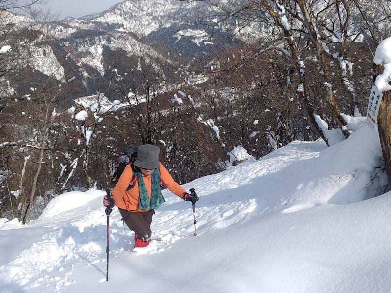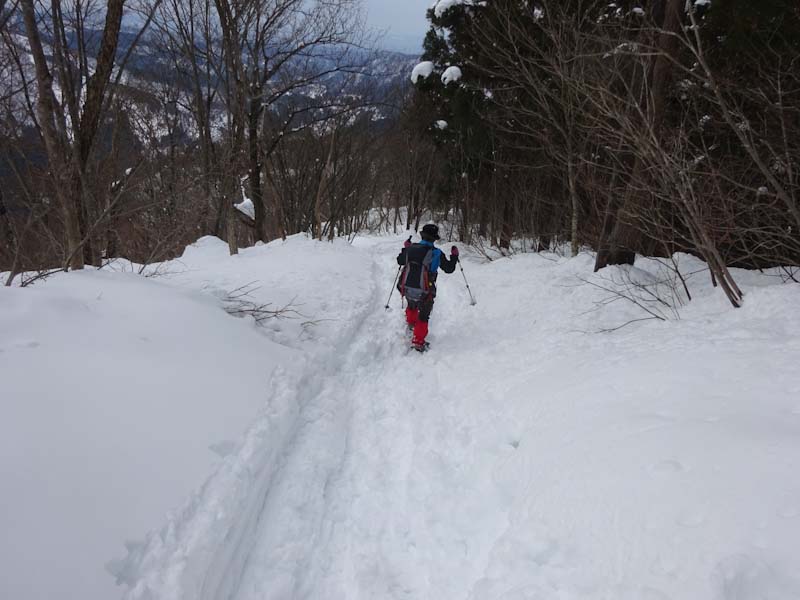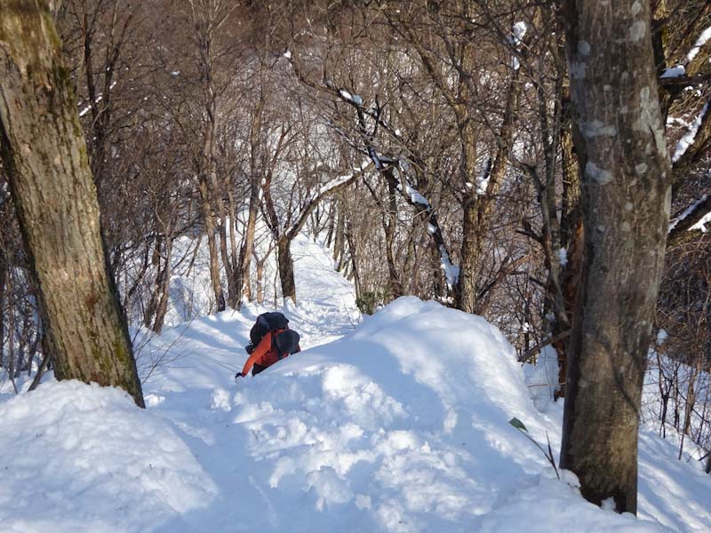途中から山スキーのトレースが出て来た。誰?と思い追い付いた。でも、その後は、スキーに勝てるわけがない。8回目の極楽坂山だったけど、初めて他の人様に会った。夏でも秋でも会った事がなかった。