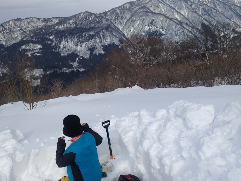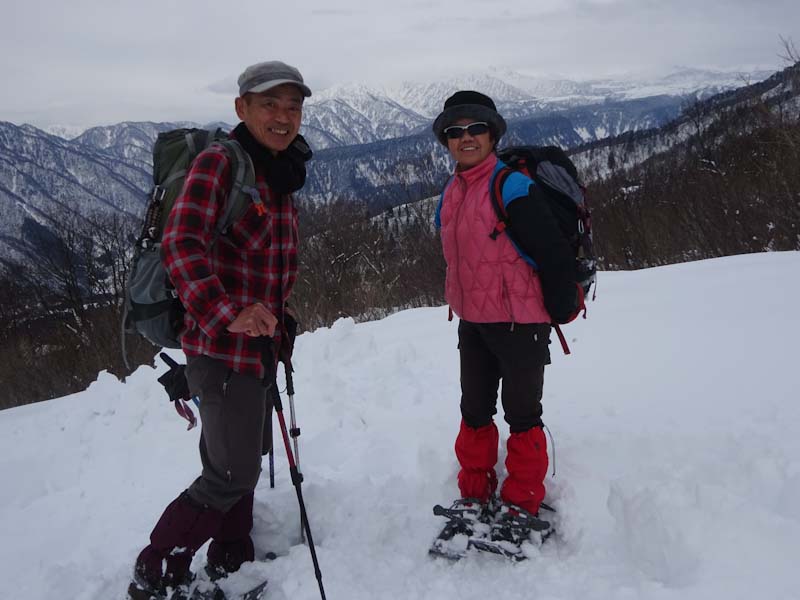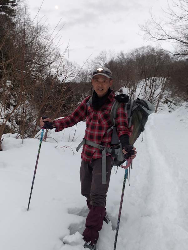 私は、相変わらず一人で、何の変哲のない山頂に向かい、自己満足の世界を味わって来た。「山ノ神」の所へ戻り、それこそカップ麺の半分を食べ下山する事にしたが、午後2時半であった。林道歩きで、「山ノ神」がスノーシューを外してしまった。それほど足が痛かったのかもしれない。でも頑張った。そして、またまたヘッデンを灯してしまった。
