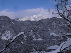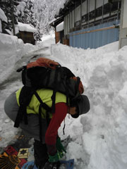 | 水上集落辺りを行く。 | 登山口の標識が雪に 埋もれ掛かっていた。 |