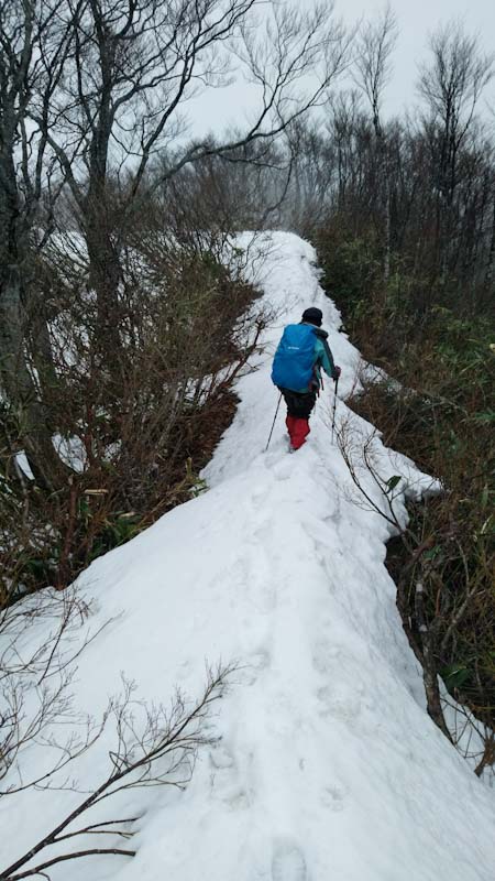 持ち通り、林道には残雪があり車をデボして歩かなければならないし、残雪が溶け出してズルっといくところもあった。しかし、雨が伴う静かな山である。誰一人来るハズもない。「これでもコロナの意に反するのか?」 とは言わないが、 「何が面白くて・・・」 と自分でも苦笑いする事がある。