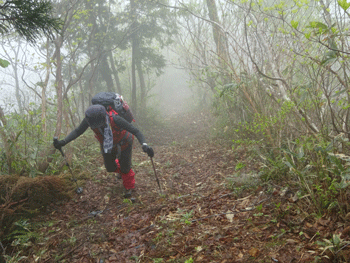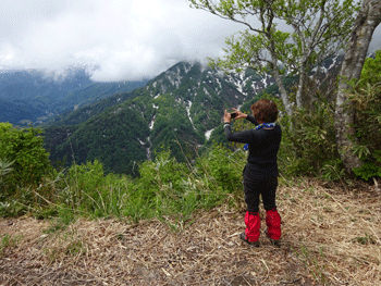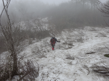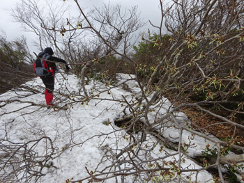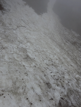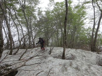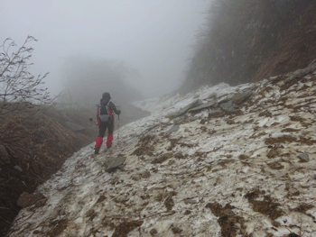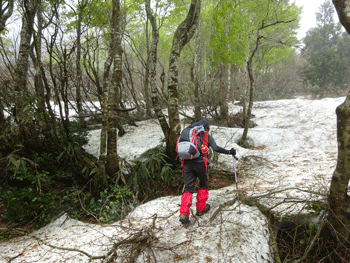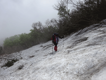 | 残雪と新緑のコントラストがキレイでした。 | 一瞬、ルートを見失いました。 |