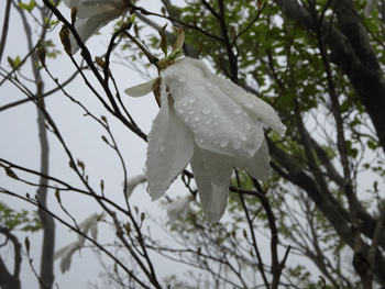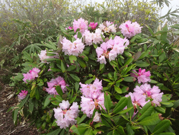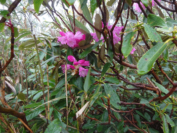 | まだ閉ざされた避難小屋です。 | 小屋付近には、シャクナゲが咲いています。 |