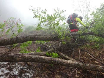 | 細尾トンネルを抜けて、ちょっと行った所から・・ | 倒木を乗り越えて・・・ |
