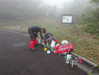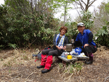 | 林道歩きⅠ時間半。コーヒータイムです。 | コーヒータイムが終わって、スタートです。 |