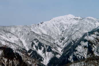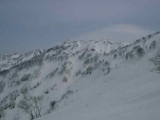 杉からナラ、クヌギの雑木になったと思ったら、何処からともなく、スキーのトレースが現れる。時々、そのトレースが交わりまた離れている。カンジキ跡の上に、スキーの跡が重なっている。“誰だろう!”“何人なんだろう!”と思いながらトレースに、自分はカンジキを付けぬままで、広い尾根を先に急ぐ。732㍍のピークを確認もせず、ピッチをあげる。汗を拭いながら後を振り返ると、白鳥山が大きく見える。その栂海の稜線を、右に目を向ければ、特徴ある犬ヶ岳ピークが望める。