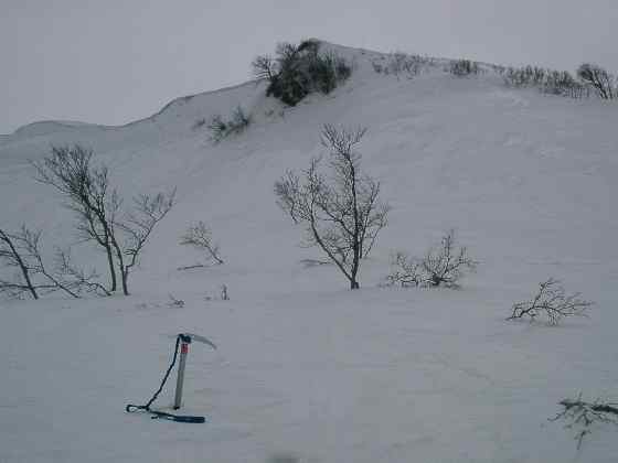 800㍍付近から尾根が益々広くなるが、900㍍付近からは、しっかりした尾根になり、おおよそ間違う事はない。山頂直下の大斜面が、ドンドン近づいて来て、クラストしている斜面が氷のように光って見える。心配していた風が強くなって来て、帽子が飛ばされそうになり、必死に抑えなければならい状態になって来る。でも、黙々と歩く。今日は、カメラの三脚もなく、自分を撮る事が出来ない事もあって、時折カメラを出すが、そんなに時間を費やさない。あまりあてにならない高度計が、1250㍍を指してた頃、尾根の一寸下がった風当たりの少ない所に男女4名のパーティーが、食事をしていた。
